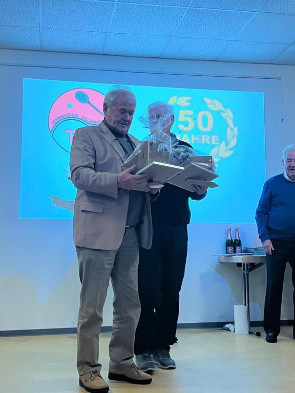Einen besonderen Moment der Feier bildeten die Grußworte des Haigerer Bürgermeisters Mario Schramm. Die Ansprache wurde von Frank Ohlenburger vorgetragen, der stellvertretend auch einen Präsentkorb entgegennahm. Darüber hinaus erhielt der Verein zahlreiche Glückwünsche und Geschenke von Ortsvereinen, der Feuerwehr, der Kirchengemeinde, dem Schützenverein sowie umliegenden Tennisclubs, die dem TVS ihre Wertschätzung entgegenbrachten.